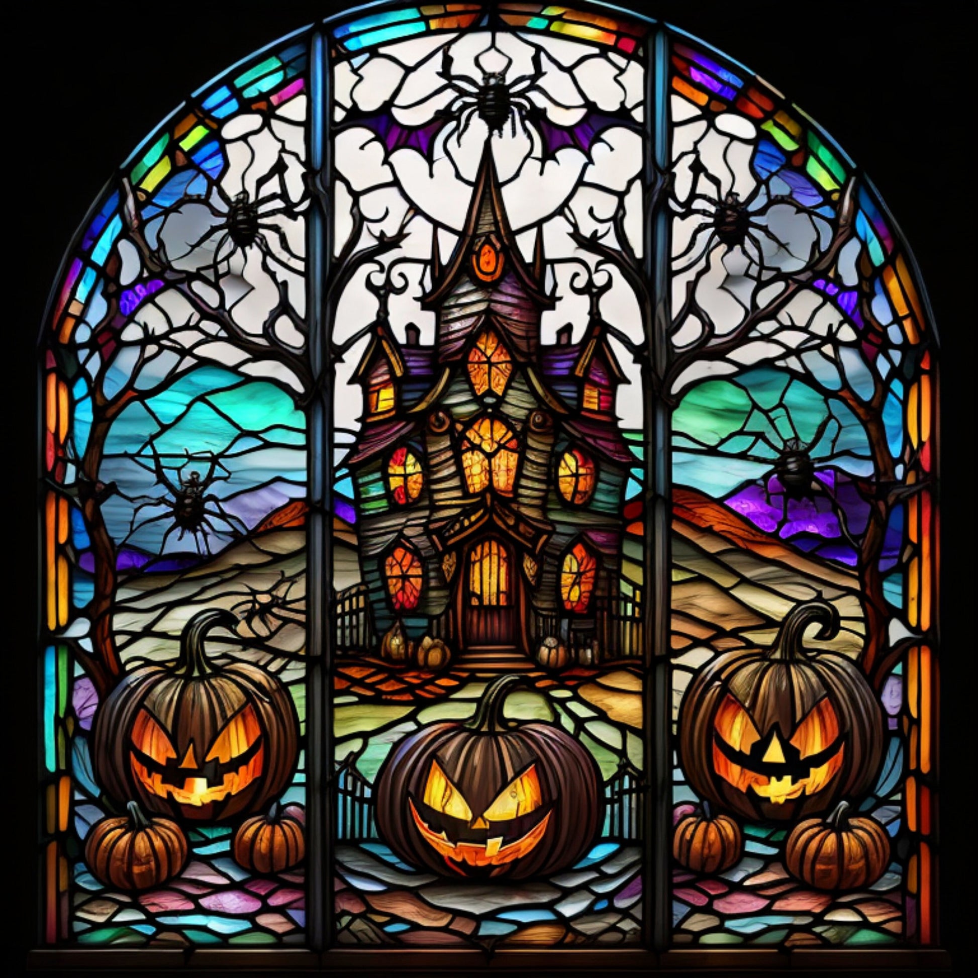 Haunted House, Faux Stained Glass Inspired, Jack-o-Lantern Sign, Halloween Sign, Metal Sign, Sublimation Sign, Signs For Wreaths (Square)